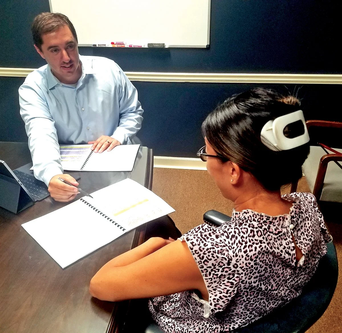 Brett Moore‚ managing partner and senior wealth advisor with RBM Wealth Management Group‚ works with a client to update her investment plan. Photo by Jackie Kennedy.