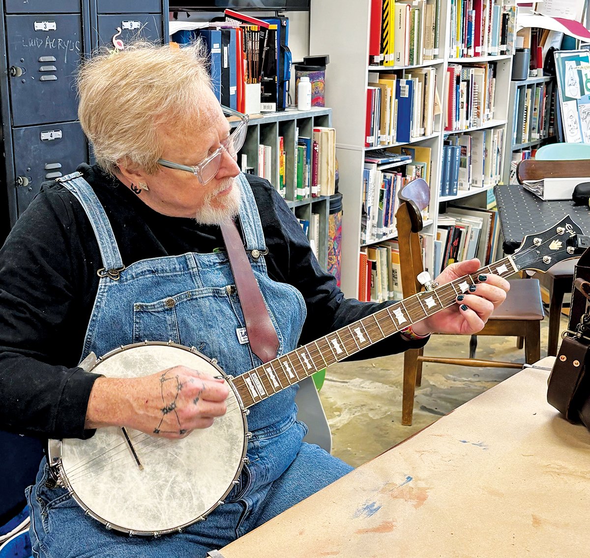 Mike Stillman tunes up his banjo. Stillman, a veteran, heads up leatherworking classes at Backstreet Arts.