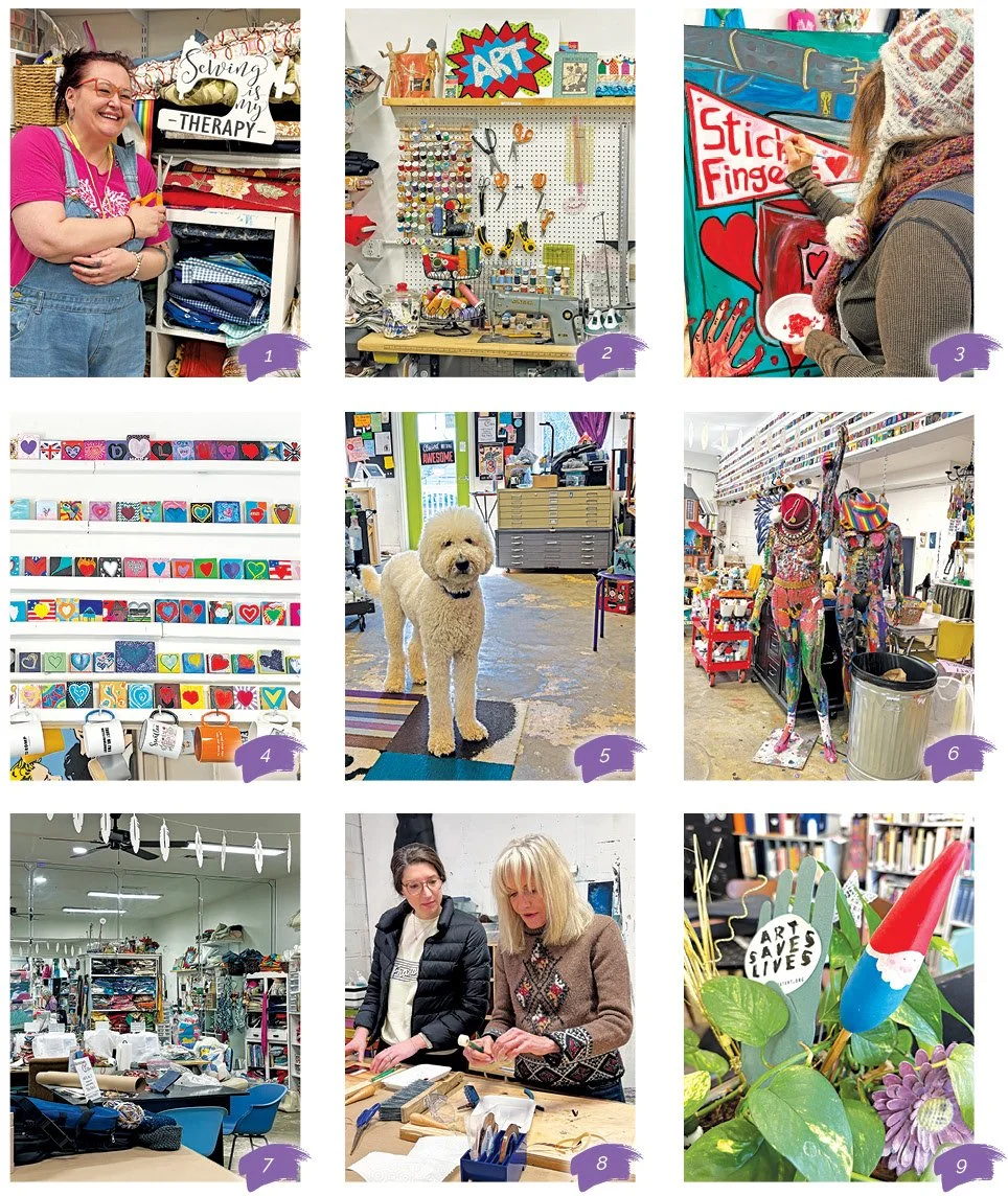 1. Sara Pace teaches mixed media, junk journaling, sewing and beading at Backstreet Arts. “People here are so nice,” she says. “It’s cheaper than therapy. It’s home.” 2. Art is the heartbeat of all that’s done at Backstreet Community Arts. 3. Faith Farrell, one of Backstreet’s dedicated volunteers, puts a finishing touch on a painting for the annual HeArt Jam fundraiser. 4. Visitors are invited to paint a small heart that’s added to the heart wall collection, which has become a colorful reminder of how many lives have been touched at Backstreet Arts. 5. Pip, the giant golden doodle, is a mainstay among artists and volunteers. 6. You name it, you’ll find it, when it comes to inspiration at Backstreet. 7. Whether it’s a cup of coffee or a plethora of art supplies with which to create, all are readily available at the downtown Newnan space. 8. Emily Stumbo, left, was invited by her friend Elaine Bronstein to join in the fun and fellowship offered to Cowetans at Backstreet Arts. 9. Art saves lives.
